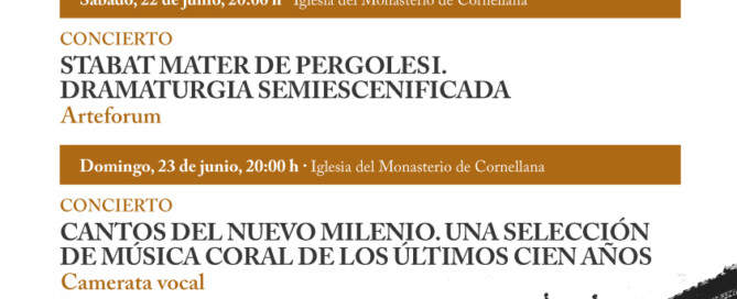 Actos del milenario de la fundación del Monasterio de Cornellana. Viernes 21 de junio Conferencia: Alfonso II. El primer peregrino. Isabel San Sebastián (enlace al Facebook personal) Sábado 22 de junio Stabat Mater de Pergolesi. Dramaturgia semiescenificada. Arteforum Domingo 23 de junio Cantos del Nuevo milenio. Una selección de la música coral de los últimos cien años. Camerata Vocal