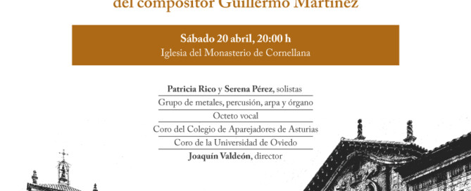 Iglesia del Monasterio de San Salvador de Cornellana Sábado 20 de abril de 2024, 20 horas Estreno de la Cantata Sancti Salvatoris in Corneliana, del compositor asturiano Guillermo Martínez. Inspirada en el acta fundacional del monasterio de 31 de mayo de 1024, esta obra musical ha sido creada para conmemorar el milenario de la fundación del Monasterio de Cornellana (1024-2024) [...]