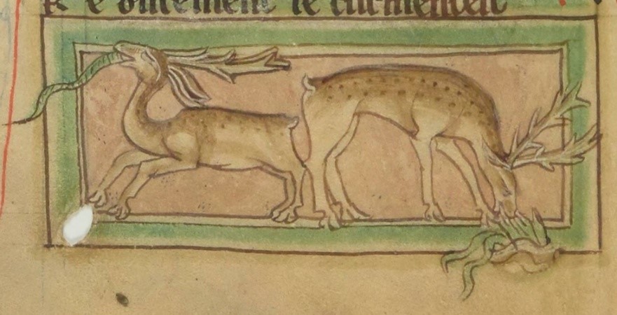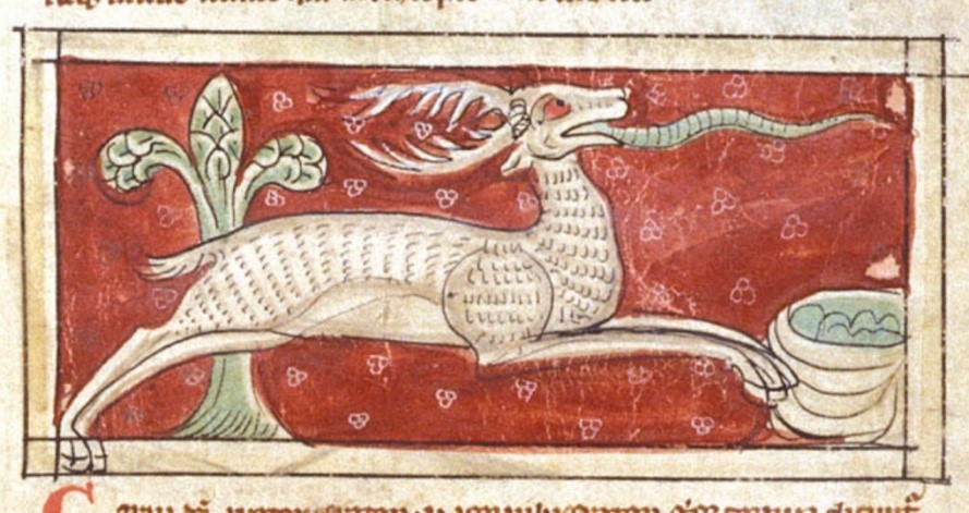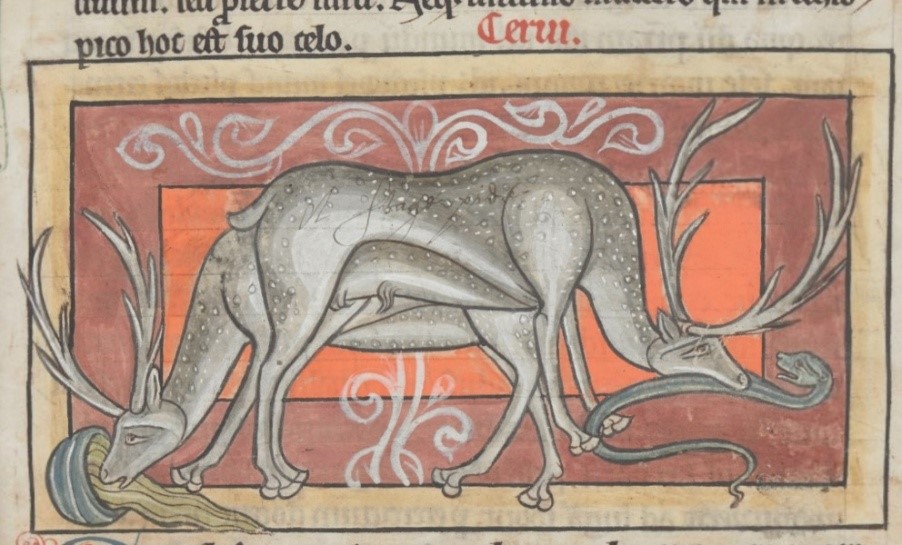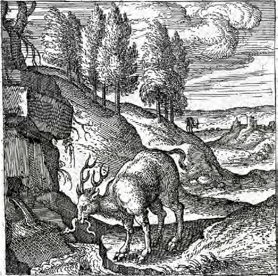 La enemistad proverbial entre el ciervo y la serpiente, que subyace en la apuesta entre ambos animales, se refiere ya en el Physiologus griego, cuya redacción primitiva se sitúa en Alejandría hacia el siglo II de nuestra era y se conoce a través la traducción latina realizada en el siglo VIII. Esta versión latina alcanzó una amplia difusión en toda Europa hasta el siglo XII y describe la relación entre ambos animales en los siguientes términos: «El ciervo vive durante cincuenta años, y al final de ese periodo corre a gran velocidad por los valles boscosos y los barrancos de las montañas, localiza por su olor las madrigueras de las serpientes, y de inmediato acerca sus narices a la entrada de aquéllas, conteniendo el aliento. Entonces, la serpiente se precipita afuera y va a parar a la boca del ciervo, que se la traga; por eso se le llama élafos, porque sacó a la serpiente de las profundidades. Luego, corre con la serpiente hacia un arroyo; si no bebe agua antes de tres horas, morirá; pero si encuentra agua, vivirá otros cincuenta años».
