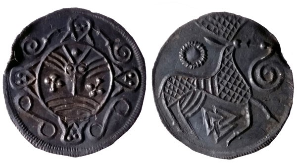 Moneda vikinga encontrada en Ribe (Dinamarca), acuñada en el siglo IX, en cuyo reverso figura un ciervo y una serpiente